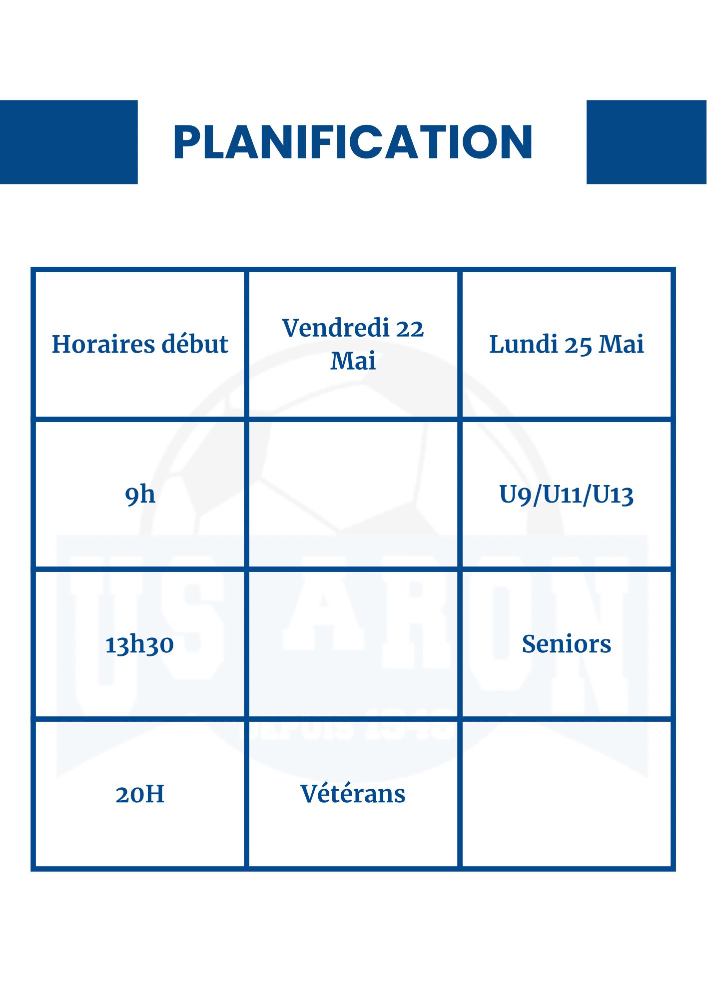Le traditionnel tournoi de l'US ARON se déroulera le lundi 25 mai 2026 (U9-U11-U13 matin Seniors AM) Nouveauté cette année un tournoi vétérans aura lieu le vendredi 22 mai à partir de 20h00