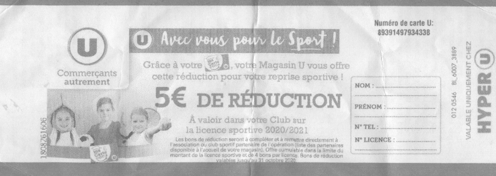 Le Partenariat concernant les coupons de réductions de 5€ pour la licence de football est reconduit pour la saison 2020 2021. Les coupons de réduction de 5€ peuvent être utilisés dans la limite de 4 coupons soit 20€ par licenciés. Les coupons doivent nous être retourné avec le paiement de votre licence avant le 15 Octobre 2020. Passé ce délai nous ne pourrons plus les prendre en compte.